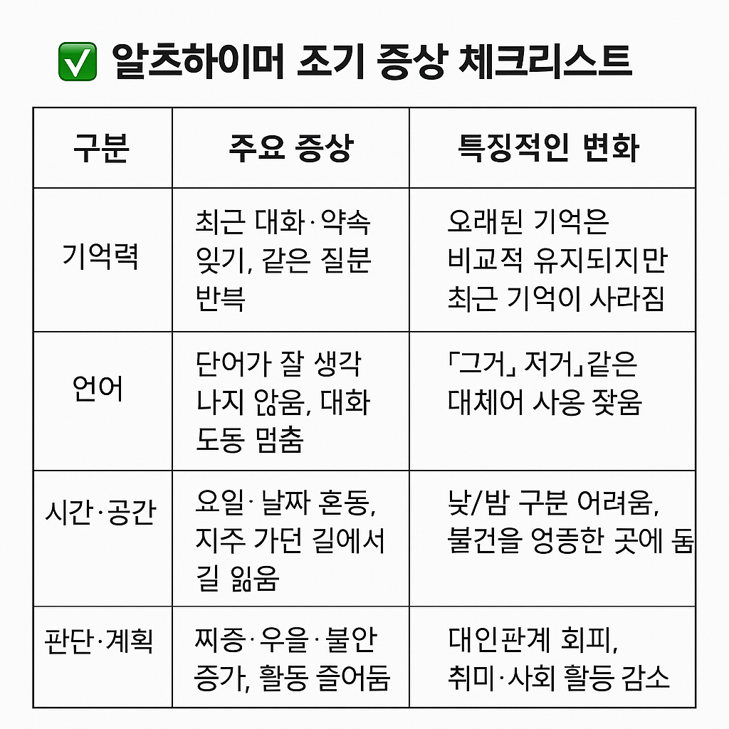 나이가 들수록 기억력이 예전 같지 않다는 것을 누구나 한 번쯤 느끼게 됩니다. 하지만 단순한 건망증과 달리, 알츠하이머병의 초기 증상은 일상생활 전반에 영향을 주며 서서히 진행되는 특징이 있습니다. 특히 초기에 나타나는 변화를 잘 알아두면 조기 진단과 치료에 큰 도움이 되기 때문에 많은 분들이 관심을 가지시는 주제입니다. 오늘은 알츠하이머 초기 증상이 어떤 모습으로 나타나는지, 또 어떤 점에서 일반적인 노화와 다른지를 정리해 보겠습니다.