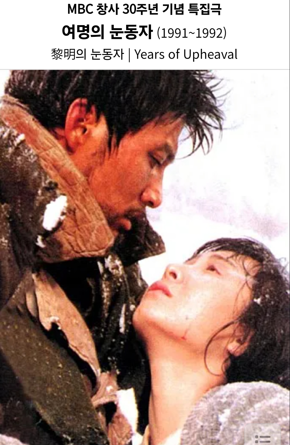 분단과 전쟁, 사랑과 신념 사이에서 흔들리는 사람들의 이야기를 보고 싶다면, 《여명의 눈동자》는 반드시 봐야 할 작품입니다.