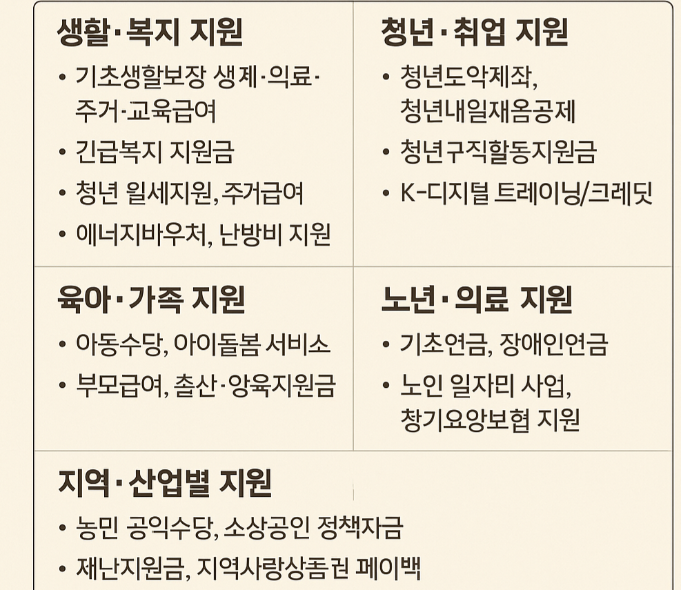 • 재난지원금: 경기 침체나 자연재해 시 일시적으로 지급되어 가계 부담을 줄여줍니다.