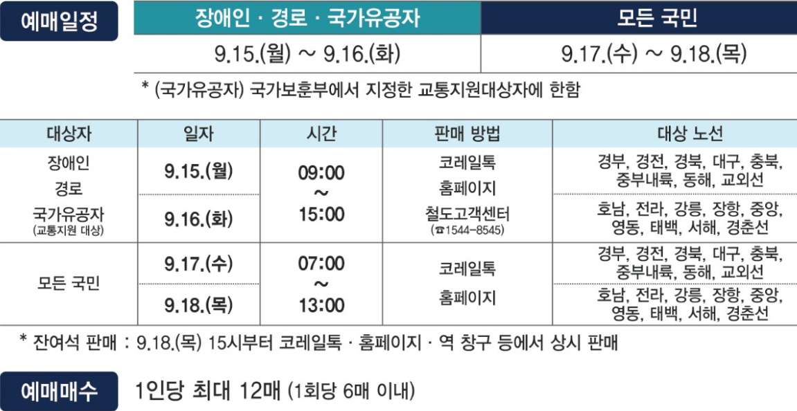 | 경로·장애인·국가유공자 | 9월 15일(월)~16일(화) | 09:00~15:00 | 코레일톡, 홈페이지, 고객센터 |