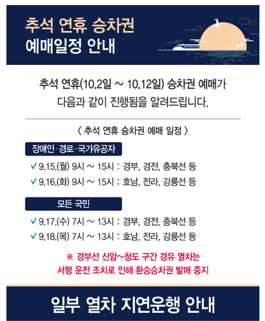 | 잔여석 예매 | 9월 18일(목) | 15:00~ | 역 창구, 코레일톡, 홈페이지 |
