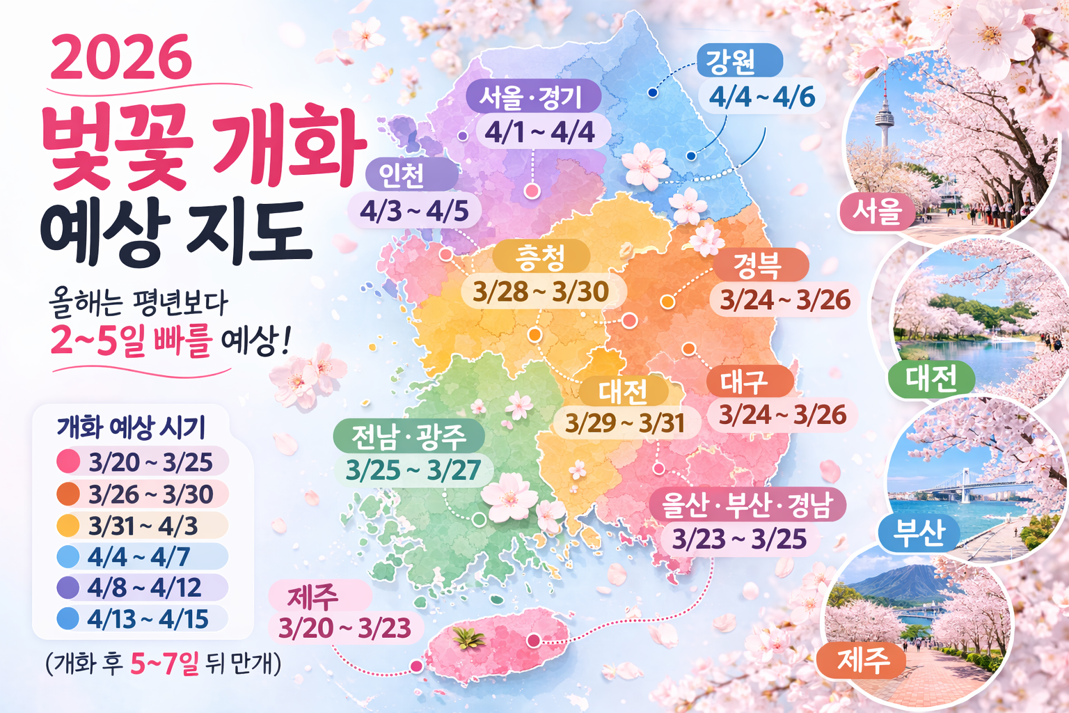 봄이 다가오면 많은 사람들이 기다리는 풍경이 있습니다. 바로 전국 곳곳을 분홍빛으로 물들이는 벚꽃입니다. 하지만 벚꽃은 개화 기간이 짧기 때문에 시기를 놓치면 제대로 즐기기 어렵습니다.
